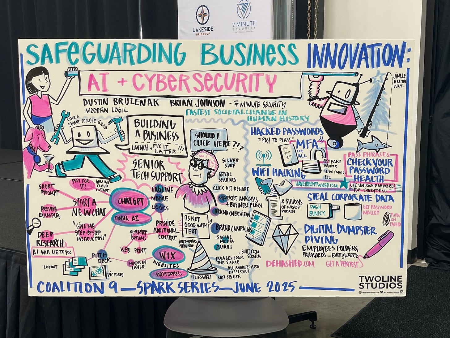 Hope you had a great week. I just wanted to share a really cool visual that was part of an event I spoke at Thursday. A company called TwoLine Studios had an artist illustrate the event live as it unfolded! The image you see below started with a blank page at the beginning of the day, and the artist drew it freehand - starting from the left side as the first speaker presented (a really cool talk from Dustin at Modern Logic who built a business from scratch using AI and suggestions from the audience), and then working her way to the right during my talk about hacker dirty tricks: